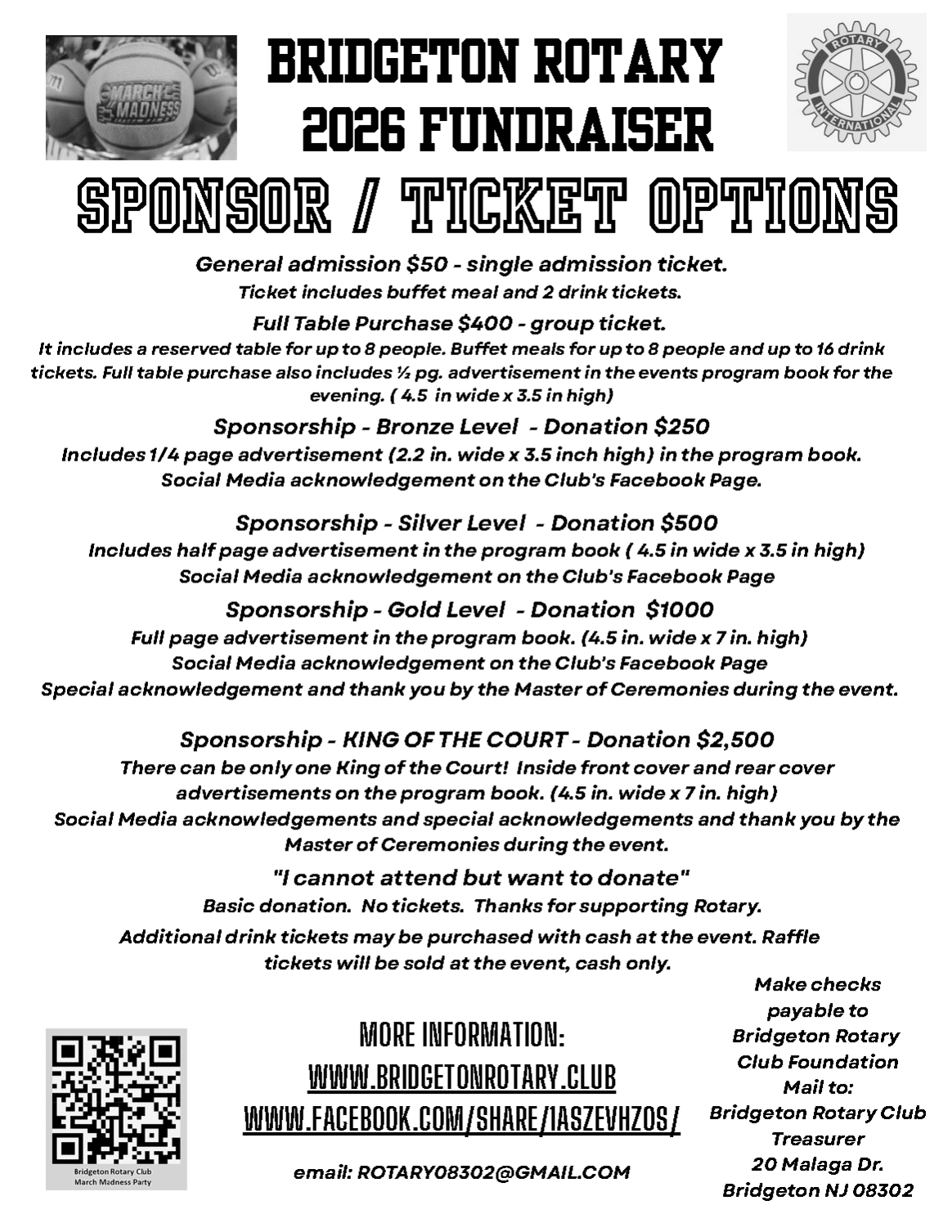 mail checks to: Bridgeton Rotary Club Treaurer, 20 Malaga Drive, Bridgeton NJ 08302