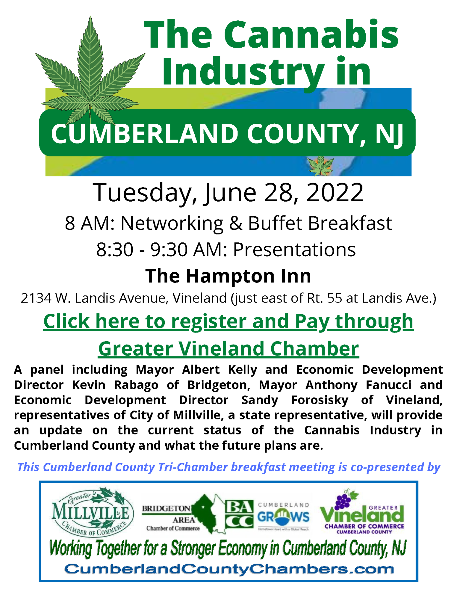 The Greater Vineland, Greater Millville and Bridgeton Area Chambers of Commerce are pleased to present this breakfast event. A panel including Mayor Albert Kelly and Economic Development Director Kevin Rabago of Bridgeton, Mayor Anthony Fanucci and Economic Development Director Sandy Forosisky of Vineland, representatives of City of Millville, a state representative, will provide an update on the current status of the Cannabis Industry in Cumberland County and what the future plans are.
